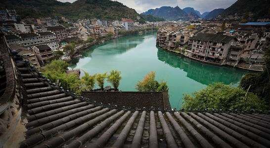登上庇护镇远的屏障---石屏山,极目远眺镇远古城,一幢幢排列有序的民居、飞檐翘角的屋顶、浅灰色的墙体、蜿蜒流淌的舞阳河,古镇倚在舞阳河的两旁,贴崖而上的青龙洞给人以轻盈灵动之感。