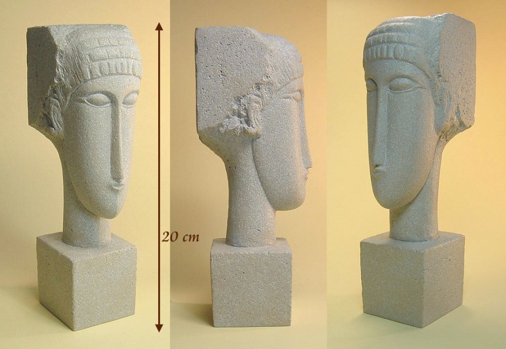 也许是他对爱的执着对物质的藐视,他这满腹的“牢骚”终于让上帝在他35岁那年在他生命只有最后一年多的时侯,把那个属于他的拥有高尚灵魂美丽女子带到了他的身边,她就是小莫迪11岁,莫迪后期许多画作的模特——珍妮。而最令我最最神往,每看一次都会被深深打动的是她给珍妮画的第一幅画。【见封面】这幅画并不是莫迪利亚尼的代表作,也不是价值最高的作品。但所有莫迪利亚尼画作的精髓都倾注其中,更使它与众不同的是它开启了莫迪利亚尼新的生活带给人们一段凄美泣血的故事。它是莫迪后半生的创作源泉,即便那只有不到一年半的时间。它像莫迪后期所有的画作一样,背景被抽象的处理成大块的色彩,这简单的色彩简洁的形取代了过去繁复的生活背景,文艺复兴以来所注重的透视也没有了,印象主义以来所看重的光和色彩的主观表达也在野兽派之前做了更大胆尝试。这在当时绘画氛围里尤其是在肖像画的领域里在背景处理上绝对不仅仅是叛逆那么简单而是一次巨大的跨越,这是对印象主义大胆的解读和延续。他独立于同时期盛行的野兽派、图【九】未来主义图【十】立体派【十一】之外,显得格外与众不同。因为莫迪将背景更加模糊和单纯的目的与众不同,他是为了背景更加简单让人物更加突出,也十分有利于体现莫迪所看重的“人物的灵魂”。而野兽派则是要将色彩相对造型的地位更大程度的扩大和加强。与此同时莫迪在造型上也独树一帜,莫迪让人物的脖子修长而优雅这是他长期热爱黑非洲雕塑的结果,莫迪有很长一段时甚至是雕塑家而不是画家,而他的雕塑作品的风格直接映射出他后期油画作品的风格。图【十二】对此许多花钱请莫迪画肖像的人都接受不了。而这仅仅是莫迪让人接受不了的众多因素之一。在这幅珍妮一号作品中当然也不例外。莫迪作品最有特色的地方应是人物的眼睛,除开为了生存而不得不替人画的肖像外,凡是莫迪在意的作品几乎都没有眼睛,只是用一抹颜色来替代。每幅作品眼睛的色彩都不一样,这幅作品珍妮的眼睛显得格外的透彻和迷人,莫迪当时一定处于非常自信和甜蜜当中,当然珍妮本身迷人的眼睛也功不可没。在乎眼睛的画家往往会被眼睛所吸引,这是一份不可抗拒的魔力。说到莫迪画眼睛的技法有一种评论说是莫迪受到了古希腊雕塑作品的影响,众所周知古希腊的雕塑先贤们喜欢用凹陷的眼洞来代替人物的眼球,据说这样处理的人物眼神更耐人寻味,而且随着光线的变化会呈现出不同神情。而我以为莫迪真正要表达的是对人类灵魂的未知和探索,还有自己身处乱世的孤独感。