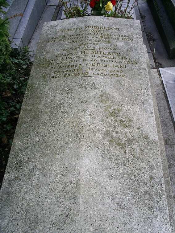 夜幕降临,巴黎下起了大雪。已经是八点差五分了,万众瞩目的1919年艺术沙龙马上就要开始。艺术家、社会名流齐聚一堂。怀孕的珍妮和母亲也在现场,但仍不见莫迪利亚尼的影子。8点整教堂的钟声敲过,沙龙准时揭开序幕。一幅幅令人期待的画作并排放在众人的面前。每幅画上都盖着一块白色的亚麻布,等待被人一一的揭开。莫迪利亚尼任然没有出现,画作被一件一件的揭晓引来一阵阵赞叹和掌声。倒数第二件是毕加索的作品,当他的画被揭晓时,大家看到一幅用立方体堆砌起来的人物肖像画——莫迪利亚尼。现场观众爆发出经久不息的掌声和喝彩声,整个沙龙都沸腾了。而此时珍妮四处张望着仍然不见莫迪利亚尼踪迹。最后揭晓的是莫迪利亚尼的作品,人们屏住呼吸,当幕布揭开的那一刹那,人们惊呆了,空气在整个会场凝结了,长久的寂静之后毕加索带头打破了沉默,他心服口服的鼓着掌,整个会场顿时雷鸣般的掌声不绝于耳,只见画布上一位身着蓝色缎绒晚装的孕妇端坐在椅子上,恬美而优雅。这个人正是珍妮,只是让所有人都意想不到的是,这个珍妮有着一双迷人的眼睛。图【十三】对于从来不画眼睛的莫迪利亚尼真是太阳从西边出来的举措。这个举动连毕加索都自叹不如,珍妮感动得泪流满面。这幅画无疑取得了巨大的成功,莫迪利亚尼的身价也会瞬间飙升。但就是此时,巴黎街道上的卷曲着一个即将被大雪掩埋的人,他就是莫迪利亚尼。过度劳累的创作过程使他死于肺出血,他倒在了离成功只有一步的地方,手上拿着刚刚办好的结婚证。临死前他终于做到了他向珍妮的承诺“我一定会画出你的眼睛”。珍妮知道莫迪去世的消息后悲痛万分尽管有孕在身也追随莫迪而去。最后,人们在他们的棺木上写着“莫迪尼亚里& 珍妮以及他们的孩子长眠于此” 图【十四】