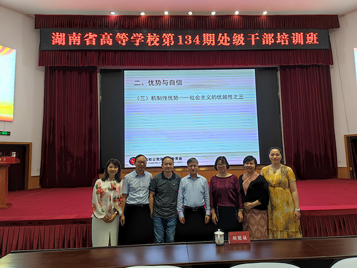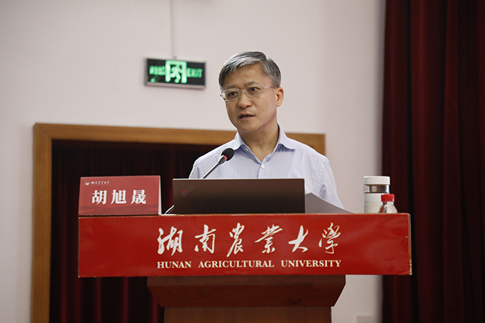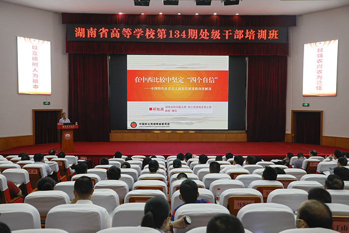 6月1日上午,省政协副主席、致公党湖南省委会主委胡旭晟在湖南农业大学修业学堂为省高校第134期处级干部培训班学员授课。本期培训班全体学员参加,湖南农业大学党委委员、组织部部长兼党校常务副校长毛祥成主持。致公党湖南农大总支主委刘东波,副主委张杰、周南,第一支部主委陈智勇,第二支部主委王丹及部分党员列席。
