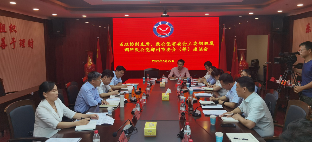 6月22日下午,省政协副主席、致公党湖南省委会主委胡旭晟在郴州调研致公党郴州市委会(筹)工作。省委会副主委兼秘书长、机关二级巡视员田宗之,中共郴州市委常委、市委统战部部长欧阳锋出席调研座谈会并讲话。郴州市政协副主席、致公党市委会(筹)主委李志珍汇报有关工作。