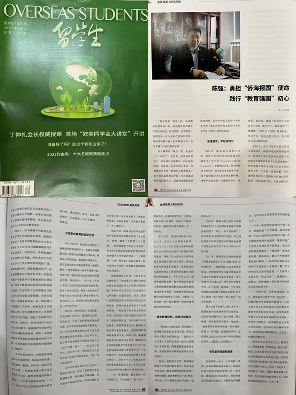 近日,中国欧美同学会旗下《留学生》杂志刊登了致公党员陈强的专题报道——《陈强:勇担“侨海报国”使命 践行“教育强国”初心》 。