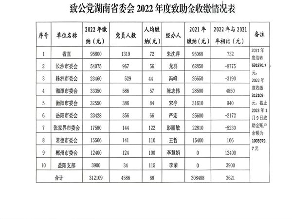 在全省各级组织和广大党员的大力支持下,致公党湖南省委会已完成2022年度致助金的缴纳。为进一步加强致助金的管理、使用和监督,省委会特公布2022年度致助金缴纳情况,详情见下表: