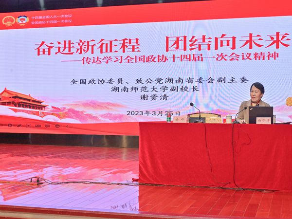 谢资清以《奋进新征程,团结向未来》为题,从会议基本情况、会议主要精神、住湘全国政协委员履职情况、个人履职情况传达学习全国政协十四届一次会议精神。