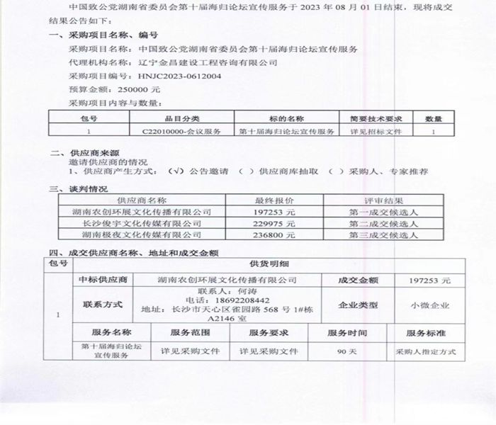 第十届海归论坛宣传服务竞争性谈判成交公告
