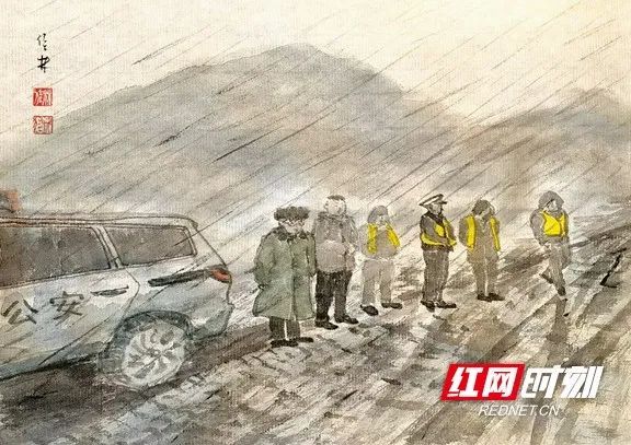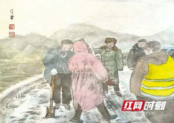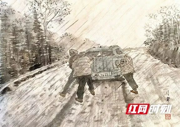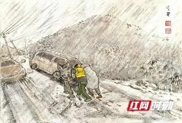 2月3日,大范围雨雪冰冻天气来袭,仅一个小时就造成永顺县小溪镇内路面湿滑、结冰,给群众出行带来了极大的不便,小溪镇干部群众立即行动,疏通道路、劝导车辆。湖南青年画家、湖南致公书画院副院长刘佳林在网络上看到小溪镇干部在风雪中逆行的情景颇为感动,为小溪镇干部素描一组风雪“逆行人”组图。