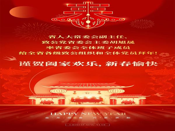 玉兔辞旧岁,金龙迎新春。值此辞旧迎新的美好时刻,谨向长期关心和支持我们事业发展的各级领导、社会各界朋友,向广大归侨、侨眷、海外侨胞和海外留学人员,向全体致公党员、党务工作者及其家人,致以新春的问候和诚挚的祝福!2023年是全面贯彻落实中共二十大精神的开局之年。这一年,我们坚持以习近平新时代中国特色社会主义思想为指导,团结带领全省各级致公组织和广大致公党员,以建设高素质高效能有活力有贡献参政党地方组织为目标,赓续“致力为公跟党走”优良传统、担当“侨海报国建新功”崇高使命,锚定“三高四新”美好蓝图,以“五大品牌”建设为抓手,深入推进“人才兴党”和“整体提升”战略,探索推进党内激励体系建设,着力助推高质量发展,各项工作取得新成效,实现七届省委会工作的良好开局。