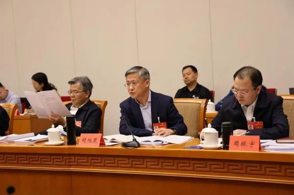 图为湖南省人大常委会副主任、致公党湖南省委会主委胡旭晟(中)在十四届全国人大二次会议湖南代表团小组会议上发言