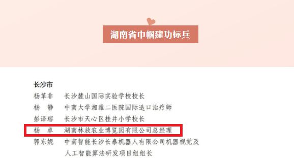 为广泛宣传巾帼建功活动示范集体和个人的典型事迹,进一步引领和激励广大妇女坚定不移听党话、跟党奋进新征程,在第114个三八国际妇女节来临之际,省妇联决定,在 2023-2024 年度湖南省城乡妇女岗位建功示范创建活动中,认定200个单位为湖南省巾帼文明岗、60人为湖南省巾帼建功标兵等。其中,长沙市致公党员、湖南林放农业博览园有限公司总经理杨卓荣获湖南省巾帼建功标兵。