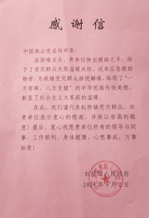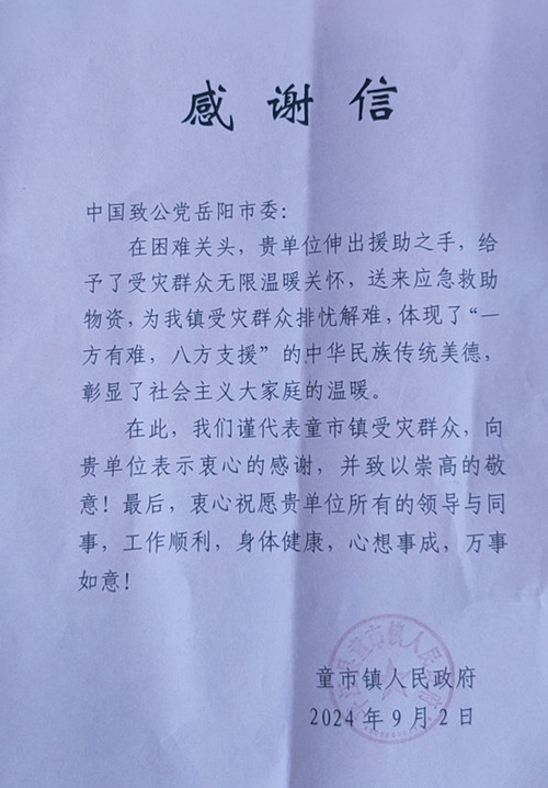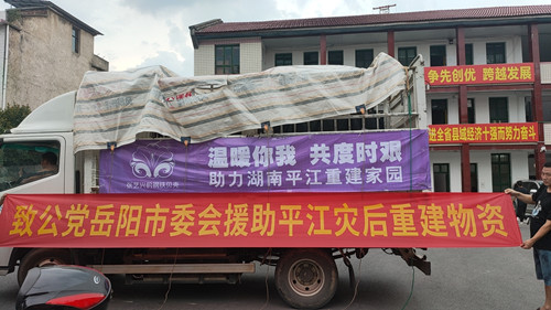 自今年7月岳阳市多个县市区遭受洪涝灾害以来,致公党岳阳市委会高度关注,并就灾区重建工作积极争取到了公益爱心捐赠。9月2日,张艺兴的钢铁贝壳、中国社会福利基金会、长沙市政协湘园委员工作室三家联合捐赠10万元共300份生活物资送往平江县。