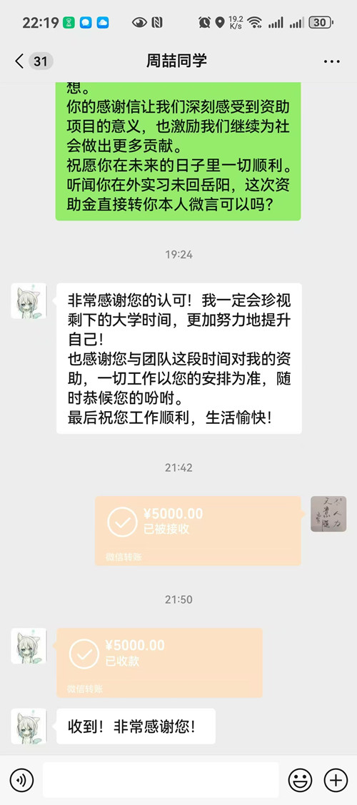 9月3日,正值学校开学季,致公党湖南省委会社会服务工作委员会副主任、致公党岳阳市委会社会服务工作委员会主任龚迎军坚持爱心助学,将5000元助学金通过微信转给自2022年就开始资助的周喆同学,并鼓励他树立正确的人生观、价值观,将来为国家的发展贡献自己的力量。