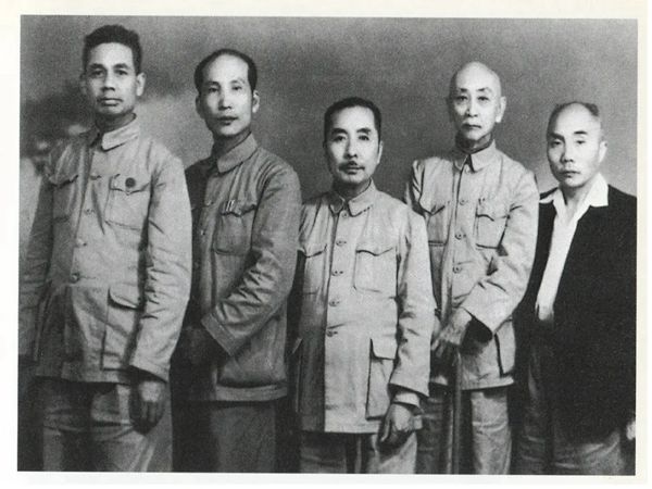 北上参加中国人民政治协商会议第一届全体会议的中国致公党代表。自左至右:雷荣珂、黄鼎臣、陈其尤、官文森、严希纯。