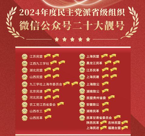 12月3日,在团结报社2024年度新闻舆论工作表彰会上,2024年度“民主党派省级组织微信公众号二十大靓号”“民主党派市级组织微信公众号二十大靓号”“民革省级组织微信公众号十大靓号”“民革市级组织微信公众号十大靓号”重磅发布,共有70家民主党派省市级组织微信公众号登上这四个榜单。