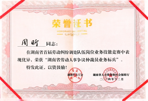 12月6日,在湖南省总工会与省人社厅联合举办的首届全省劳动纠纷调处队伍岗位业务技能竞赛中,致公党员周昕以出色的表现荣获“仲裁业务标兵”称号。