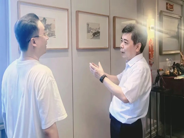 田宗之参观了刘佳林创作的书画作品,详细了解刘佳林的创作理念,近期创作成果,日常工作和生活状况。刘佳林介绍了自己在书画创作过程中的灵感来源和创作心得,展示了近期创作的书画作品。