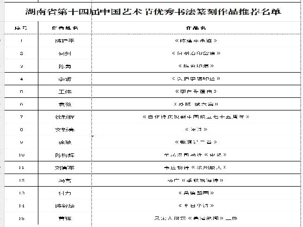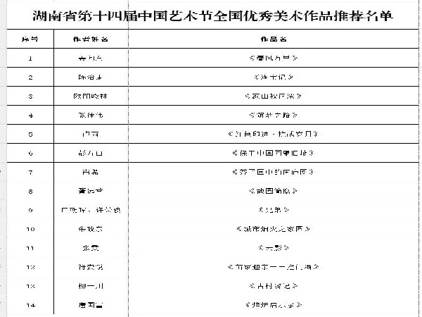 近日,经湖南省文化和旅游厅组织评审,拟推荐美术作品14件、书法篆刻作品15件、摄影作品14件参加第十四届中国艺术节展览,其中,致公党岳阳市直三支部党员王伟、柳一川、胥远香、张雯四人的作品入选全国优秀作品推荐名单,展现了岳阳文艺界的高水准和岳阳致公党员的艺术风采。